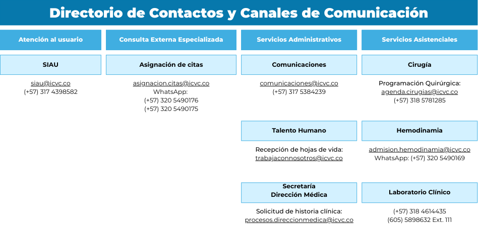 Este espacio reúne la información de contacto de las áreas asistenciales y administrativas disponibles para la atención de usuarios, pacientes, familiares y aliados.